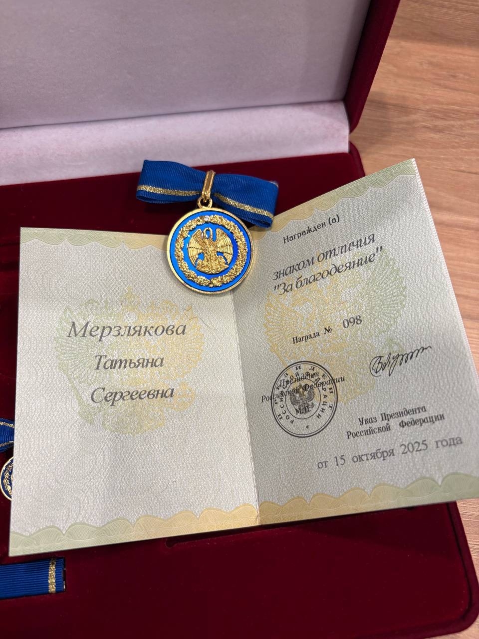 Татьяна Мерзлякова награждена знаком отличия «За благодеяние»